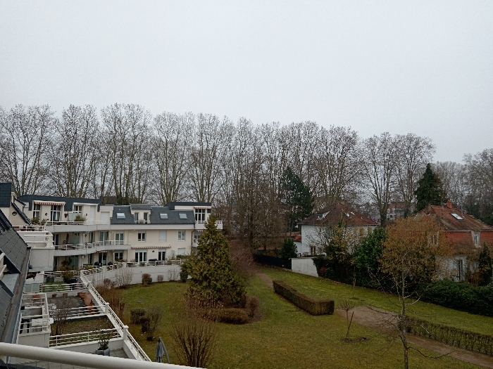 The image presents an elevated view of a residential area in Illkirch-Graffenstaden, France, under an overcast sky, indicative of late autumn or winter. The scene is observed from a vantage point behind a white metal balcony railing, visible in the lower left. In the left midground, a multi-story, light-colored (off-white) residential building with a dark gray pitched roof is prominent. This structure features multiple balconies with white metal railings, some adorned with striped red and white retractable awnings. Below this building, terraced sections with white railings and sparse vegetation are visible. The central and right midground are dominated by a large grassy area, traversed by a winding dirt path. A low, rectangular trimmed hedge runs parallel to the path on the left. The area contains numerous trees, primarily bare deciduous trees with dark trunks and branches, along with at least one prominent conical evergreen tree situated towards the center-right. In the background, two single-family houses with light-colored facades and reddish-orange tiled roofs are partially visible through the vegetation, surrounded by additional bare trees and dense foliage. A continuous line of tall, bare deciduous trees forms a dense backdrop across the entire upper midground and horizon. The sky is uniformly gray and overcast, with no direct sunlight. No individuals or specific actions are discernible within the frame.