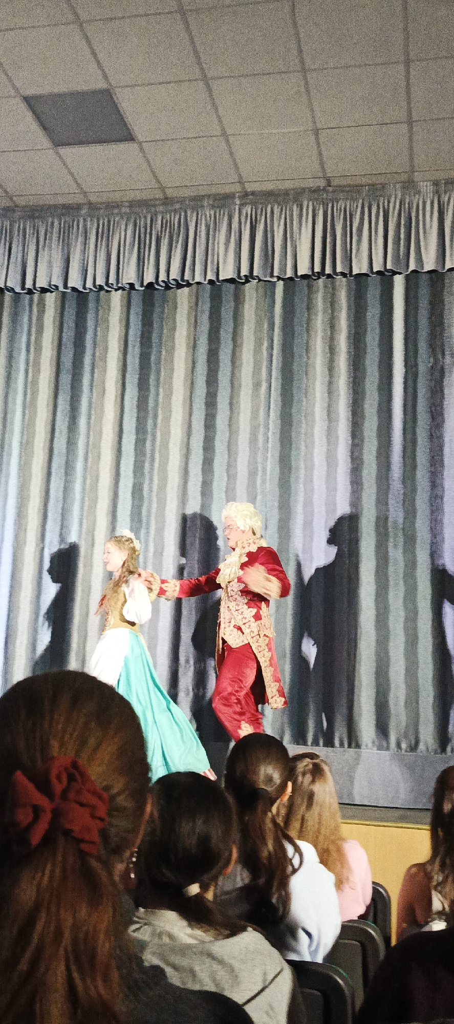 theatrical performance taking place on a stage. In the foreground are audience members seated in rows of chairs. A man and a woman dressed in what appears to be period costumes are performing on the stage. The man is wearing a red ornate suit and a white wig, while the woman is wearing a dress with a white top, a tan vest, and a long blue skirt. The stage backdrop is a striped curtain. There are shadows cast on the curtain behind the performers. It is not possible to confirm the location as Nar'yan-Mar, Russia, from the image alone.