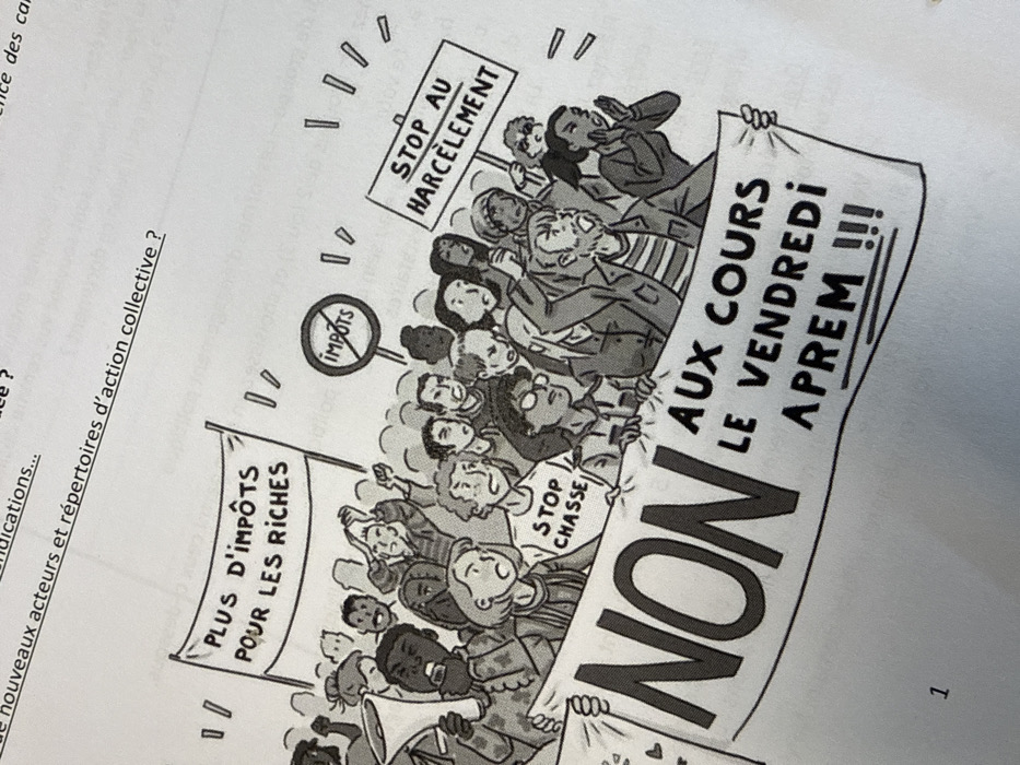 An illustration within a printed document, displaying partial text above the scene asking "...nouveaux acteurs et répertoires d'action collective ?", depicts a grayscale cartoon of a public protest occurring in Bischheim, France. The foreground presents a dense gathering of approximately 20 to 30 individuals, including men and women of diverse apparent ages and complexions. Participants are engaged in collective action, with many depicted with open mouths, suggesting shouting, and some displaying raised fists or animated gestures. Essential objects include several protest signs and banners. A prominent banner held by multiple individuals in the foreground reads, "NON AUX COURS LE VENDREDI APREM !!!" (NO TO CLASSES ON FRIDAY AFTERNOON !!!). To the far left, a person with dark skin holds and shouts into a megaphone. Above the crowd, toward the upper left, a rectangular banner displays the text "PLUS D'IMPÔTS POUR LES RICHES" (MORE TAXES FOR THE RICH). On the upper right, another sign states "STOP AU HARCÈLEMENT" (STOP HARASSMENT). Within the mid-ground of the crowd, a circular prohibition-style sign, featuring a diagonal line across the word "IMPÔTS" (TAXES), is visible. One protester in the middle wears a t-shirt inscribed with "STOP CHASSE" (STOP HUNTING). The bottom left of the document page displays the number "1". The illustration details a dynamic scene of public demonstration.