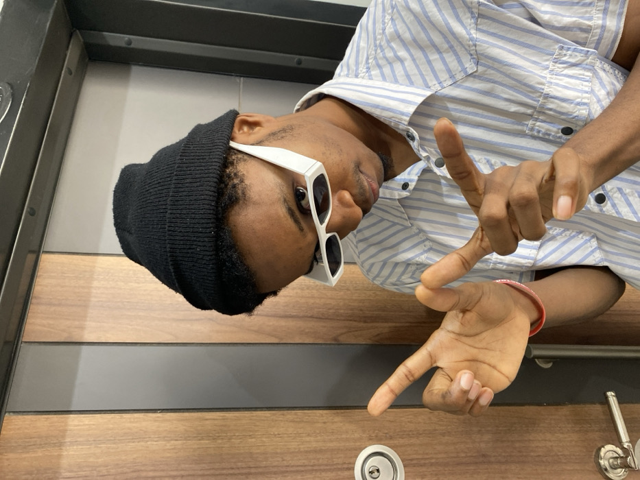 A person with a black beanie and white-framed sunglasses poses indoors with a striped shirt. The subject is positioned at an angle, facing the camera with a playful hand gesture. The background shows a modern-looking door with horizontal panels of light wood and gray metallic sections. The door handle and keyhole are visible. A red bracelet adorns the person's wrist, adding a pop of color to the image.