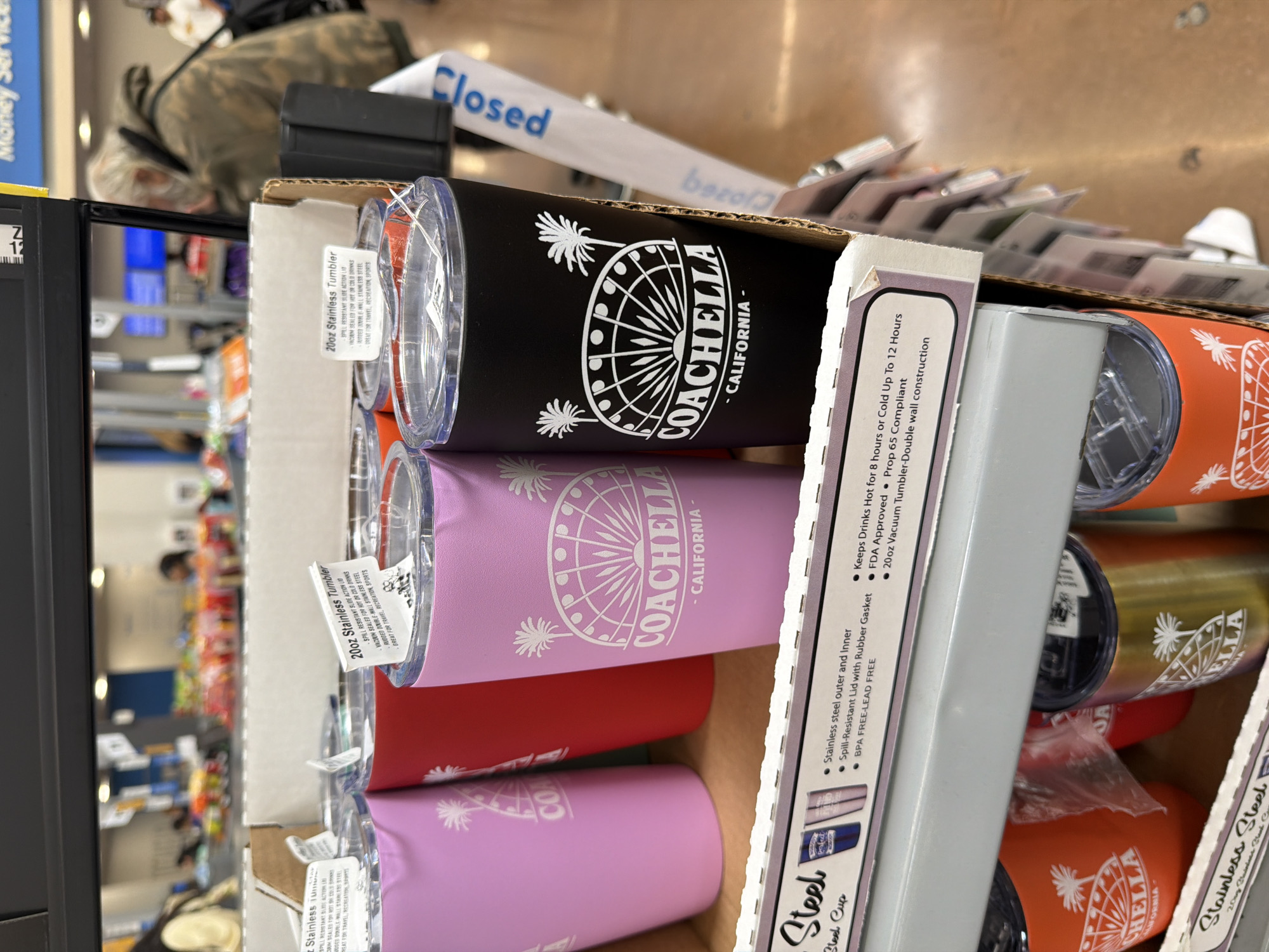 shelf in a store, possibly Walmart, filled with 20oz stainless steel tumblers. The tumblers are in boxes and display the word "COACHELLA - CALIFORNIA" with a Ferris wheel graphic. The tumblers come in various colors including black, purple, red, orange, and gold. The boxes provide product information such as "Keeps Drinks Hot for 8 hours or Cold Up To 12 Hours" and "Spill-Resistant Lid with Rubber Gasket." People and products are visible in the blurred background, including a "Closed" sign overhead. The setting appears to be an aisle in a retail store, with various products and other shoppers visible. This is likely in the city of Palm Springs, United States of America, given the branding and product offerings.