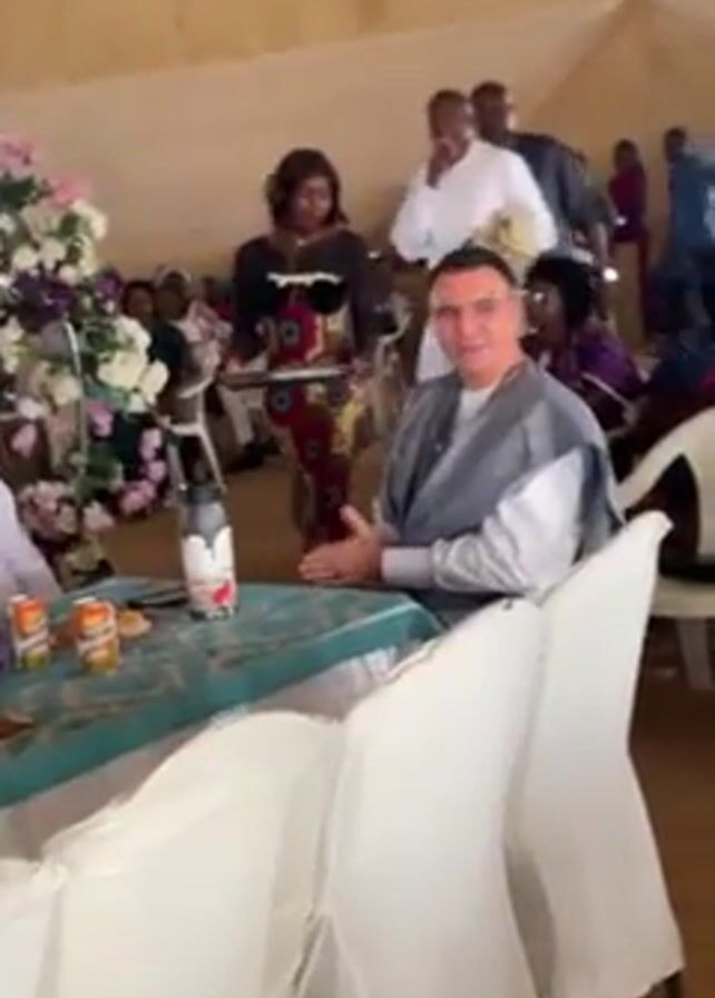 The video captures a scene inside what appears to be a banquet hall or event space, where a group of people is gathered. The hall has white chairs and tables. The table in the foreground is decorated with flowers. A man wearing glasses, a white shirt, and a gray robe-like garment is seated at the table, smiling slightly as he looks to his right. Around him, other people are standing or seated. A woman in a colorful patterned dress is serving food from a tray to the man. Two men in the background stand and watch. The overall atmosphere seems pleasant and celebratory.
