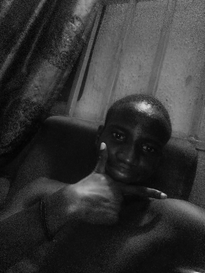 A grainy, black and white image, captured in the city of Unknown, Unknown, depicts a single male individual from the chest up in an indoor setting. The subject has dark skin and a short, buzzed haircut, looking directly at the camera with a slight smile. His right hand is raised, forming a gesture with the thumb extended upwards and the index finger extended horizontally. A dark, possibly beaded, bracelet is visible on his left wrist. The subject appears shirtless or in dark, form-fitting attire, reclining against a dark upholstered surface. The background is dark and indistinct, featuring a textured, vertically folded fabric, possibly a curtain, to the left, and vertical linear elements, suggestive of window blinds or wall paneling, to the right. The scene is characterized by dim, low-key lighting.