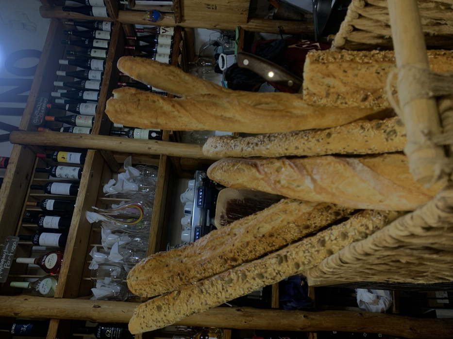 The image depicts the interior of a wine bar or restaurant located in Yerevan, Armenia. The scene is dominated by a display of food and beverages. In the foreground, a large, light-brown woven basket occupies the lower half of the frame, filled with at least seven long loaves of bread, primarily baguettes. Some loaves feature a smooth golden-brown crust, while others are heavily coated with various seeds, including sunflower, pumpkin, and sesame seeds. A horizontal light-colored wooden rod with attached netting partially obscures the bottom right portion of the basket. The midground features rustic wooden shelving supported by natural tree branches. These shelves are stocked with numerous wine bottles, many bearing white labels with black numerical prices (e.g., 3500, 5300, 5900) and handwritten signs indicating countries of origin such as "Portugal" and "Germany." Below these, a shelf holds multiple clear glass wine glasses, some containing white paper inserts, and a distinct multi-colored glass decanter. Beneath this shelf, a silver and black commercial espresso machine is visible, with white ceramic cups resting on its top. To the right, partially obscured by the bread, the back of an individual's head with dark hair is visible, wearing a dark garment over a reddish one. A large knife with a dark-brown handle and a metallic blade is positioned vertically on a wooden surface behind the bread and the individual. The background continues the shelving, displaying more wine bottles. In the upper right, a large sign with the uppercase word "VINO" is visible, illuminated by an overhead light source that causes a bright lens flare. The overall lighting is warm and dim.