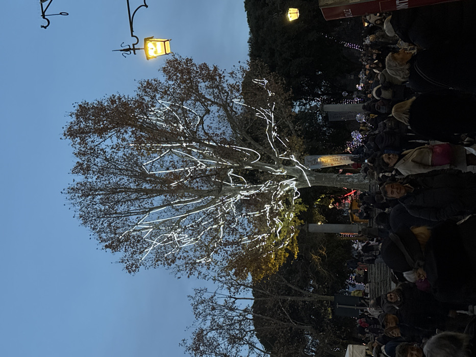 A nighttime scene shows a crowd gathered beneath a tree adorned with illuminated white lights