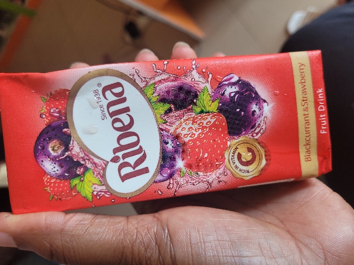 A close-up, slightly overhead view depicts a dark-skinned human hand holding a small, red Ribena Blackcurrant & Strawberry Fruit Drink carton in an indoor setting in Unknown, Unknown