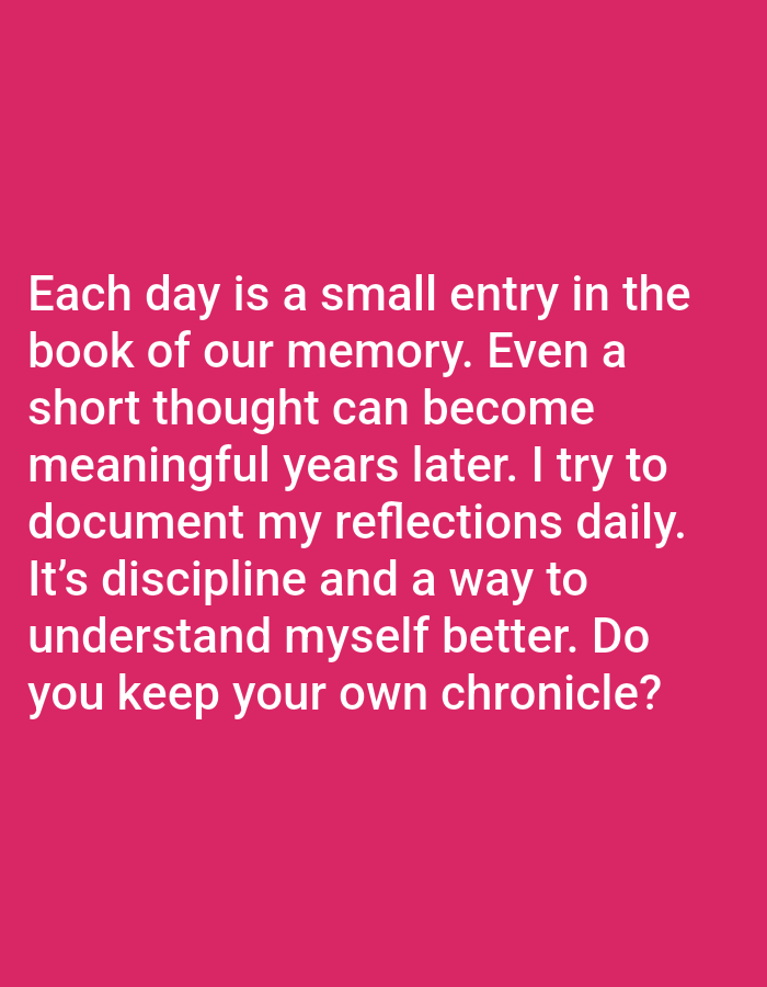 The image consists of white sans-serif text displayed against a solid magenta-pink background. The text is centered and reads: "Each day is a small entry in the book of our memory. Even a short thought can become meaningful years later. I try to document my reflections daily. It's discipline and a way to understand myself better. Do you keep your own chronicle?". No individuals are depicted, nor are any physical objects beyond the text and colored background. No specific actions or interactions are visually represented, though the text poses a rhetorical question. The environment is entirely abstract, providing no visual cues such as landscapes, buildings, or identifiable landmarks. There is no visual or textual information within the image to indicate a geographic location in the city of Yarun, Ukraine, or any other specific physical setting.