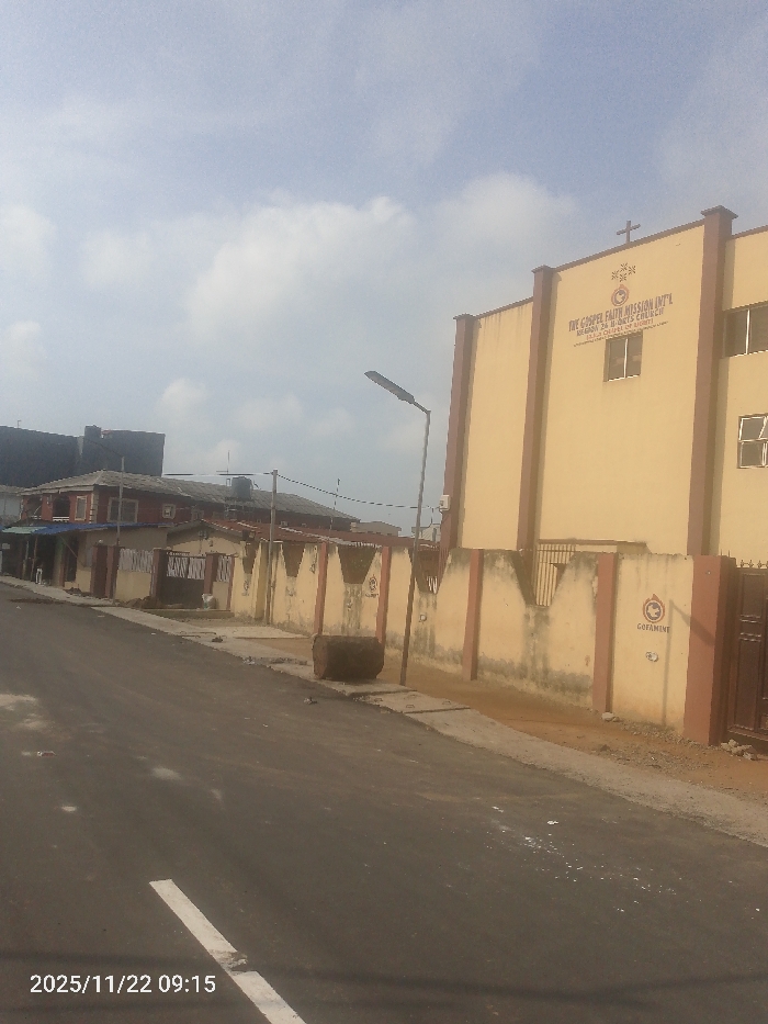 An outdoor urban scene is captured during daylight hours with an overcast sky. The image is taken from a low angle on an asphalt road. A single white horizontal line is painted on the road in the foreground. A timestamp "2025/11/22 09:15" is superimposed on the lower-left corner. The road runs alongside a concrete sidewalk, which abuts a low, painted concrete fence. The fence is yellow with red-brown pillars and coping, and sections feature decorative metal grates. Two circular logos with the text "GOFAMINT" are visible on the fence. A cylindrical wooden log rests horizontally on the sidewalk near a black, pole-mounted streetlamp. Behind the fence, to the right, stands a multi-story building with a light yellow facade and a brown entrance gate. A cross adorns the top of its front wall. A prominent sign on the building reads: "THE GOSPEL FAITH MISSION INT'L" (Gofamint), with smaller text indicating "REGION 26 H.Q. CHURCH" and "IJESHATEDO, OPEBI BRANCH." Multiple rectangular windows are visible on this structure. To the left, beyond the fence and further down the road, several other multi-story buildings of varying designs are visible, some with dark roofs and at least one with a black overhead water tank. Utility poles and overhead wires are present in the background. No individuals are visible in the scene. The location is in the city of Unknown, Unknown.