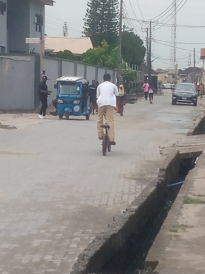 This image depicts a street scene in Iranla, Nigeria, under an overcast sky. A male individual, viewed from behind, is riding a dark-colored bicycle away from the camera, wearing a white shirt and tan trousers. The street is paved with light-colored interlocking blocks, exhibiting some damp areas. On the left side of the street, a blue three-wheeled Keke Napep (autorickshaw) with a white panel on its roof is stationary near the curb. To its left, a male subject in a black cap, black attire, and white shoes stands facing the Keke Napep. Behind them, a grey building features a partial street sign reading "OLUWANISHOLA STR." A grey concrete fence and green foliage, including a tall conifer tree, line this side of the road. An open, concrete-lined drainage ditch extends along the right side of the street in the foreground, containing a light blue pipe. A wooden plank bridges a section of this ditch. Further down the street, several pedestrians are visible, walking away from the camera; these include a person in a pink top and another in a light brown head covering. A dark-colored SUV is also present on the street in the mid-distance. The upper portion of the scene is crisscrossed with numerous overhead power lines and utility poles, with a communication tower visible in the far background.