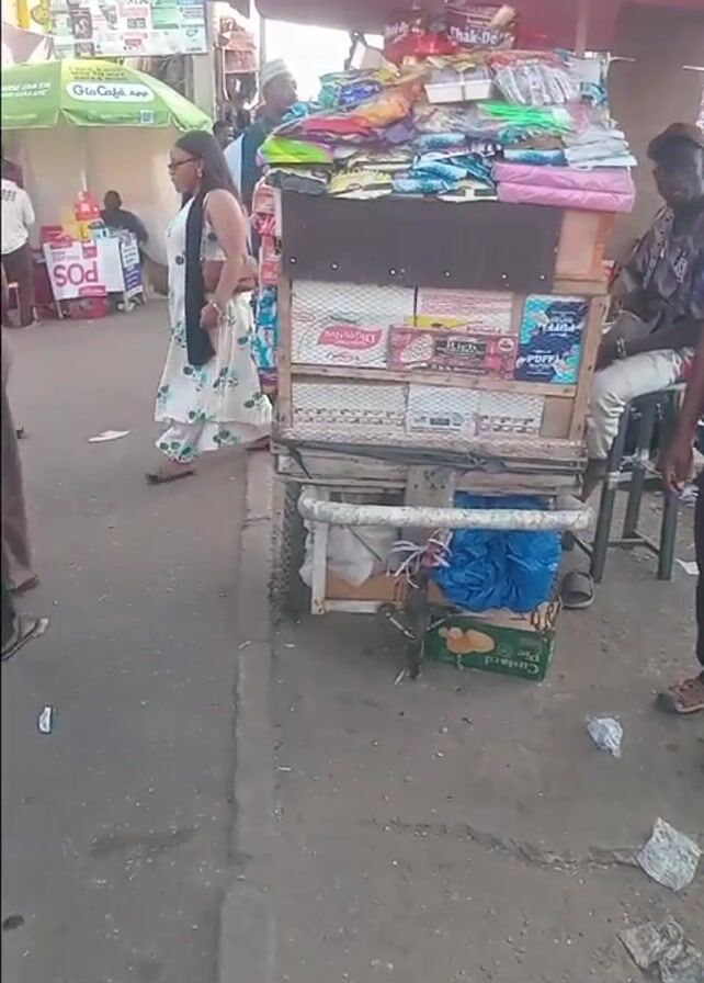 street scene, likely in an urban area. A vendor's cart laden with snacks and packaged goods sits under a pink umbrella. Several people walk by, including a woman in a white floral dress and a man in a blue patterned shirt. A group of four people stand near a red car, engaged in conversation. There is some litter on the ground. The video pans slightly to follow the movement of people.