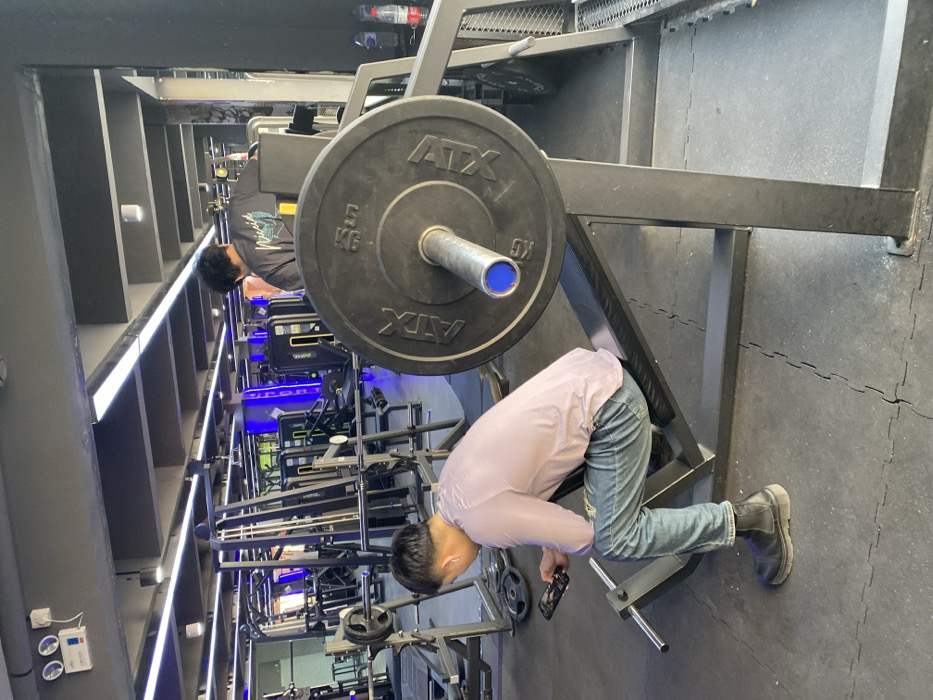 A gym scene shows two individuals seemingly interacting with weightlifting equipment. One man is visible near a squat rack with a barbell loaded with weights, while another person appears to be using a similar machine, possibly for inclined squats or seated exercises. The gym features various other exercise machines and weights, creating a dynamic and active atmosphere. The lighting is bright and modern.