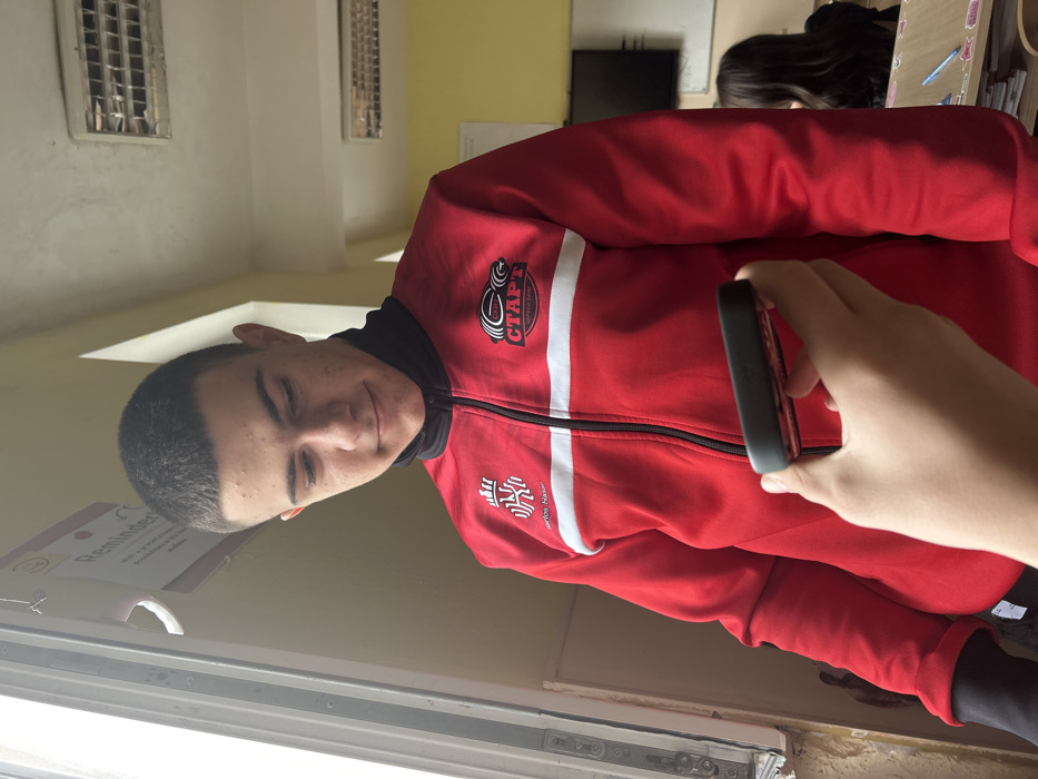 The image depicts a young male in an indoor environment, identified as Cherven Bryag, Bulgaria, by the "СТАРТ ЧЕРВЕН БРЯГ" (START CHERVEN BRYAG) text on his jacket. The male, possessing short dark hair and minor facial blemishes, is positioned centrally, looking downwards with a slight smile. He wears a red zippered tracksuit jacket with a black collar and a white horizontal stripe. The left chest of the jacket features a chess-themed logo with "Carlos Nasar" text, while the right chest displays a circular logo containing a weightlifting icon and the text "СТАРТ ЧЕРВЕН БРЯГ". In the immediate foreground, a person's hand, partially visible, holds a dark-colored smartphone horizontally, obscuring the lower portion of the male's torso. The background reveals light-colored walls, suggestive of a classroom or institutional setting, with a window frame visible on the left. Above the window, a white sign with "Reminder" and additional text is affixed to the wall. Overhead, exposed fluorescent light fixtures with grilles are visible on the ceiling. On the far right, the back of a dark-haired individual is seated at a desk, and a black monitor/TV screen is mounted on the wall.