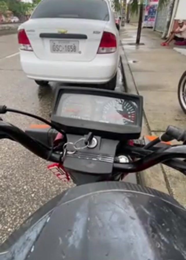 The view is from the cockpit of a parked motorcycle on a street
