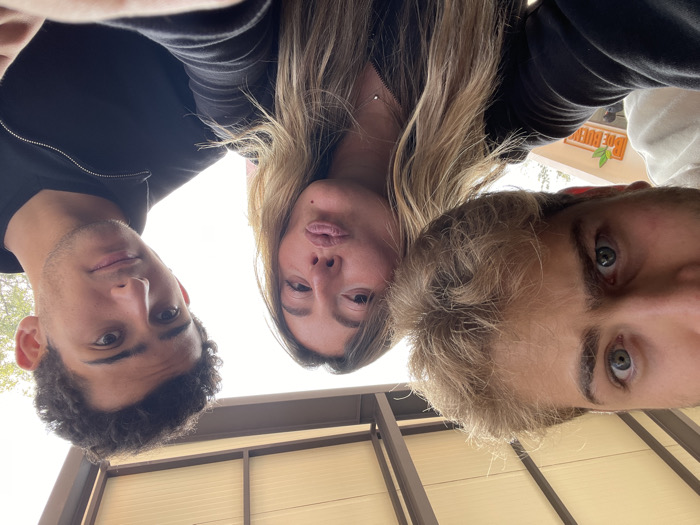 Three individuals pose for an unconventional selfie, shot from below