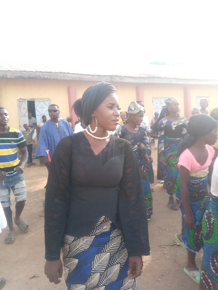 A woman wearing a black lace long-sleeved top, a head wrap, a double-strand pearl necklace, and earrings stands in the foreground. She wears a patterned skirt with blue, black, and gold leaf-like designs. Behind her, people gather, including women in similar attire, and a child in a pink shirt and a patterned skirt. A light-colored building is visible in the background under a bright sky. The ground appears dusty.