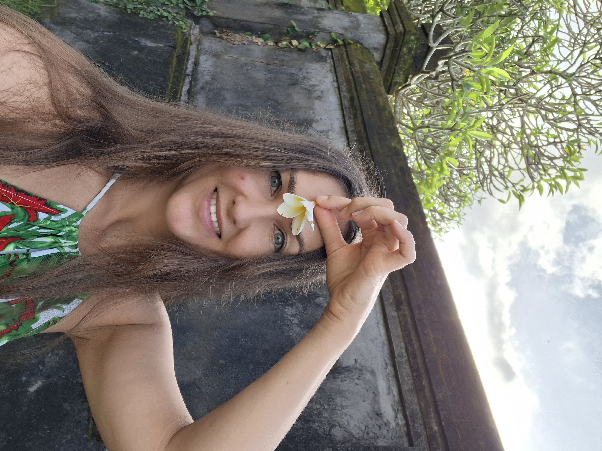 A young woman is smiling at the camera, holding a white and yellow flower to her forehead. She has light brown hair and blue eyes. She is wearing a green and red patterned top with a white strap. Behind her is a stone structure covered in moss and vines, with a tree branch visible at the top right corner of the image. In the background, there is a glimpse of a cloudy sky. The picture was taken in Lodtunduh, Indonesia.