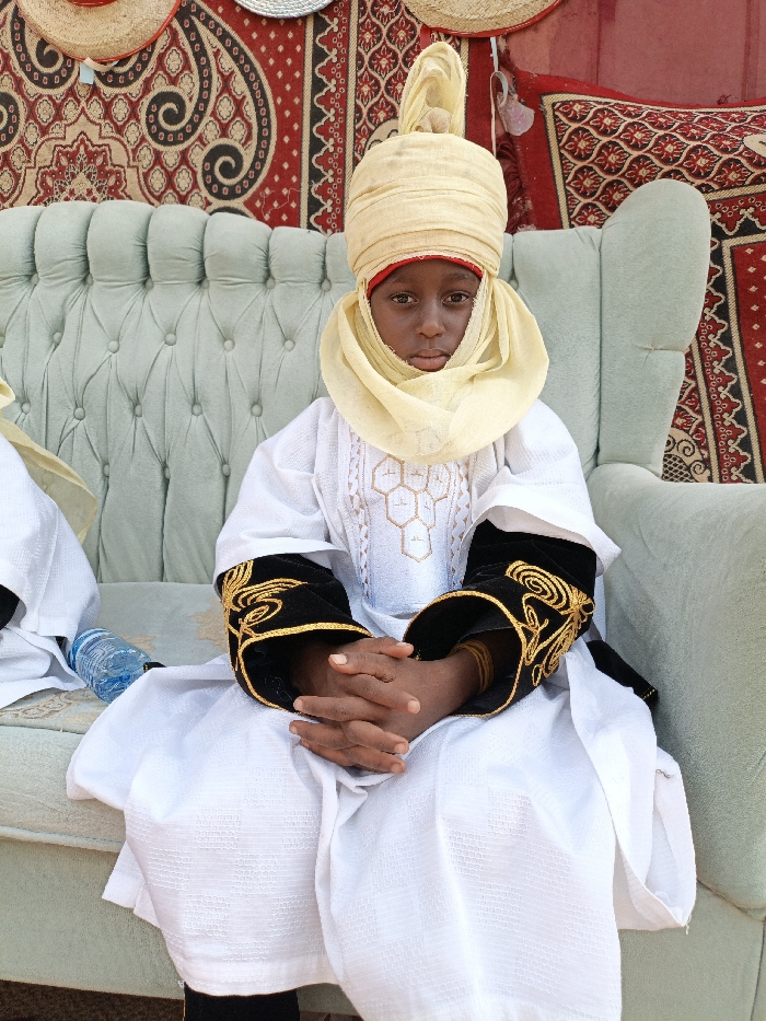 A young individual, appearing male, with dark skin, is seated upright on a light green tufted sofa in the city of Gwagwarwa, Nigeria. The individual wears a tall, pale yellow turban and a matching neck wrap. A long, white textured garment with golden hexagonal embroidery on the chest covers the torso and legs. The sleeves are black with intricate golden swirling embroidery, revealing golden bangles on the wrists. The individual's hands are clasped in front. To the left, a portion of a white garment from another person and a clear plastic water bottle with a blue cap are visible on the sofa. The background consists of a red, black, and cream patterned textile, featuring paisley and geometric designs, with several woven hats, including one with a red trim, affixed to it.