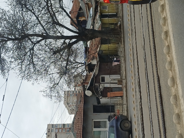 The image depicts an urban street scene in Sofia, Bulgaria, characterized by a juxtaposition of older, informal structures and modern residential blocks. The specific location appears to be along a major thoroughfare with tram lines, likely **Knyaginya Maria Luiza Boulevard**, in an area where such contrasting architecture is prevalent, possibly near the Central Railway Station or in neighborhoods like Batalova Vodenitsa. The foreground is dominated by a street with multiple sets of tram tracks embedded in worn asphalt. A line of concrete spherical bollards separates the road from the adjacent property. On the left, the rear and side of a dark blue sedan are visible, parked facing left. On the far right, the rear quarter of a yellow vehicle with a red taillight is partially visible. Beyond the tram tracks, a low, dark metal fence delineates the boundary of a row of disparate, single-story structures with pitched terracotta-tiled roofs. From left to right, these include: a grey-stuccoed building featuring a white-framed window and a dark doorway; a smaller, dark brown structure with a white door, behind which an orange panel leans; and a yellow-painted structure with a dark doorway. A white satellite dish is mounted on one of the roofs/walls. Behind the fence, near the yellow structure, a small, light-colored object resembling a clothes drying rack with fabric is present. A large, leafless deciduous tree with a prominent trunk and extensive branching stands in the midground, indicating a winter or early spring season. In the background, several multi-story, light-colored residential apartment blocks, characteristic of socialist-era construction, rise against an overcast, light grey sky. Overhead, multiple utility wires are visible against the sky. No individuals are present in the frame. The scene is static.