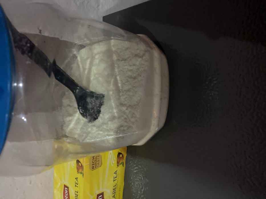 An indoor scene in the city of Mape, Nigeria, depicts a clear plastic container with an octagonal base, filled approximately one-third to one-half with a white powdered substance. A black plastic scoop rests partially submerged within the powder. To the left of the container, two yellow boxes of Lipton Yellow Label Tea are stacked horizontally, displaying brand logos, "Yellow Label Tea," and "RICH NATURAL TASTE." All items are situated on a dark, reflective surface, against a plain, light-colored background wall.