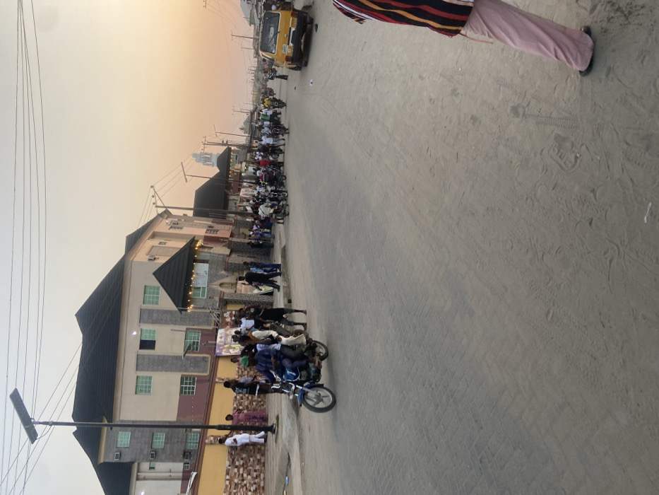 A street scene with buildings on the left side and a grey road dominating the foreground. People and motorcycles line the road, heading away into the distance. A yellow vehicle is visible further up the road. The sky is bright and hazy. The image appears to be taken from a slightly elevated position, and is tilted. A person's leg and torso are visible in the upper right corner.