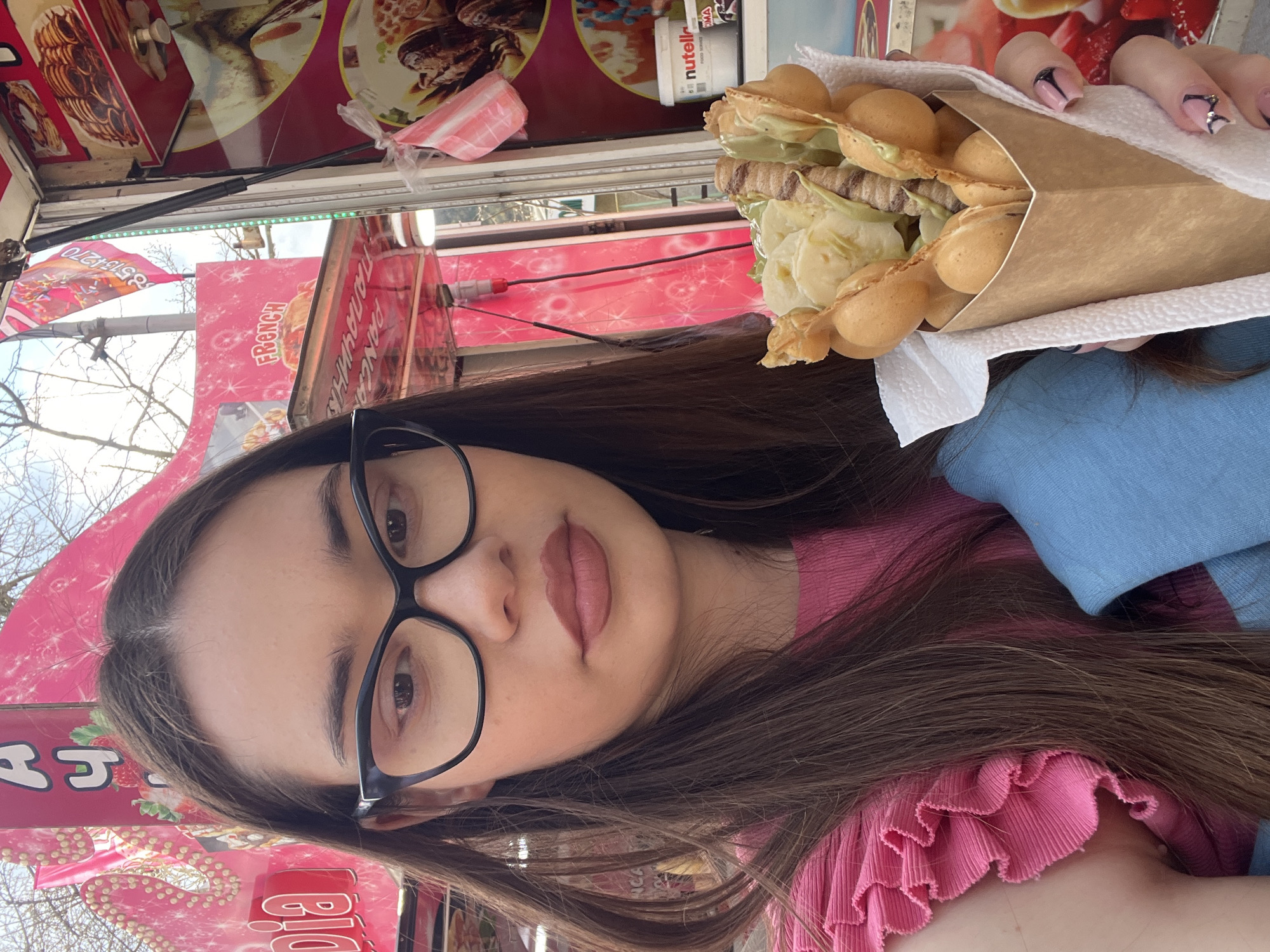 A young woman wearing glasses is holding a dessert similar to an egg waffle cone. The filling appears to be a combination of white lettuce and other fillings. The woman is wearing a pink ruffled shirt. She is standing in front of a food truck with “French Pancake” written on it, and the city is Provadia, Bulgaria.