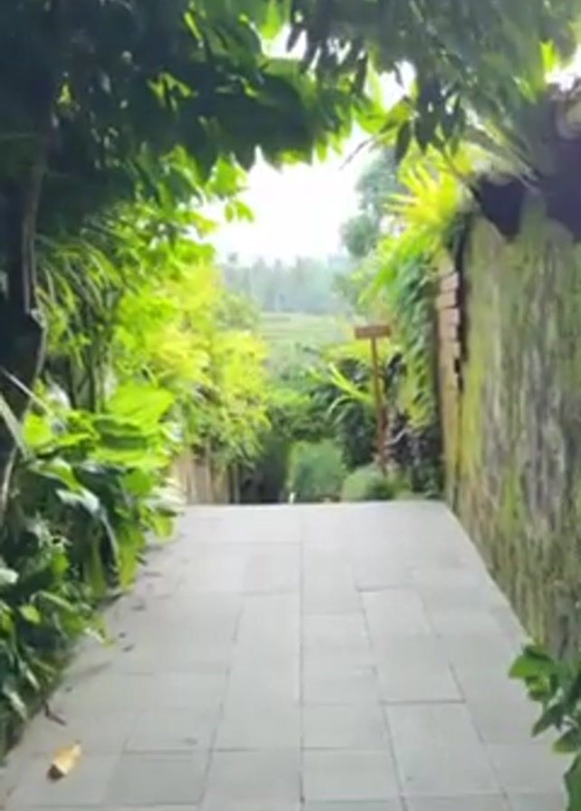 path leading downhill through a lush, green environment, likely in a tropical or subtropical area. The path is paved with gray square stones and is flanked on both sides by dense vegetation, including various types of plants and trees. A wall covered in moss runs along the right side of the path. In the distance, the path opens up to reveal terraced rice paddies, a common feature in Southeast Asian landscapes. In the far background, a hazy mountain can be seen. The video is shot from a static, slightly elevated perspective, looking down the path. The light is diffused, suggesting an overcast day. A signpost is visible on the right side of the path near the terraced fields.