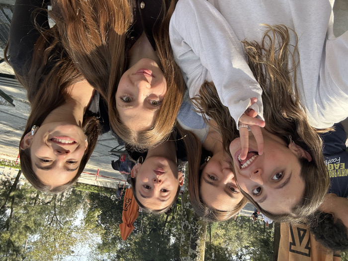 Four young women pose closely together, likely for a selfie. The image is oriented sideways. Two of the women on the left have long, brown hair, and one smiles widely. The other two are on the right side. One girl is making a peace sign with her fingers and sticking out her tongue. In the background, there are trees, a grassy area, and a glimpse of a building. The overall atmosphere is casual and cheerful.