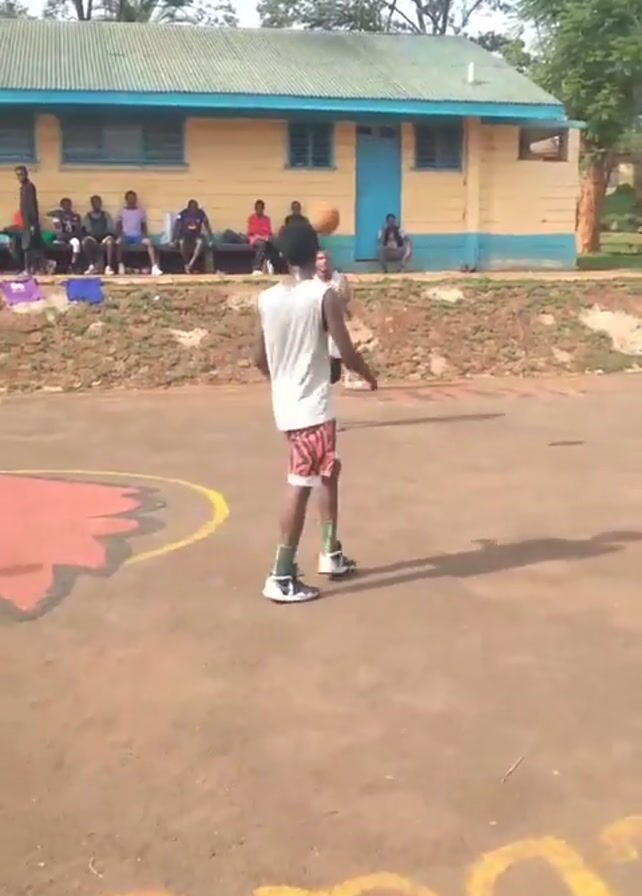 Here's a detailed description of the scene: The video shows a group of young men playing basketball on an outdoor court