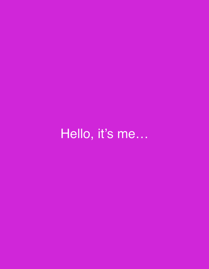 The image displays a solid magenta background. Centered horizontally, slightly above the vertical midpoint of the frame, white sans-serif text reads "Hello, it's me...". No discernible people, physical subjects, objects beyond the text, actions, interactions, or specific environmental features are present within the image. The content provides no visual information to determine a specific location in the city of Saint-Germain-en-Laye, France, or any other physical setting.