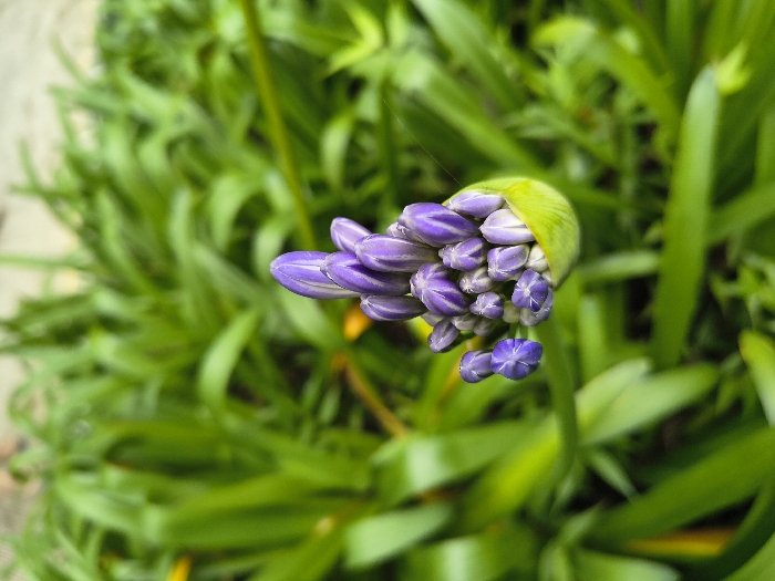 A close-up shot reveals a cluster of purple flower buds nestled among vibrant green leaves. The buds are tightly packed, varying in size and depth of color, some beginning to unfurl at the tip. They are enclosed by a pale green capsule. The surrounding leaves are long and slender. The overall impression is one of growth and budding life, with a focus on the flower's emergence.