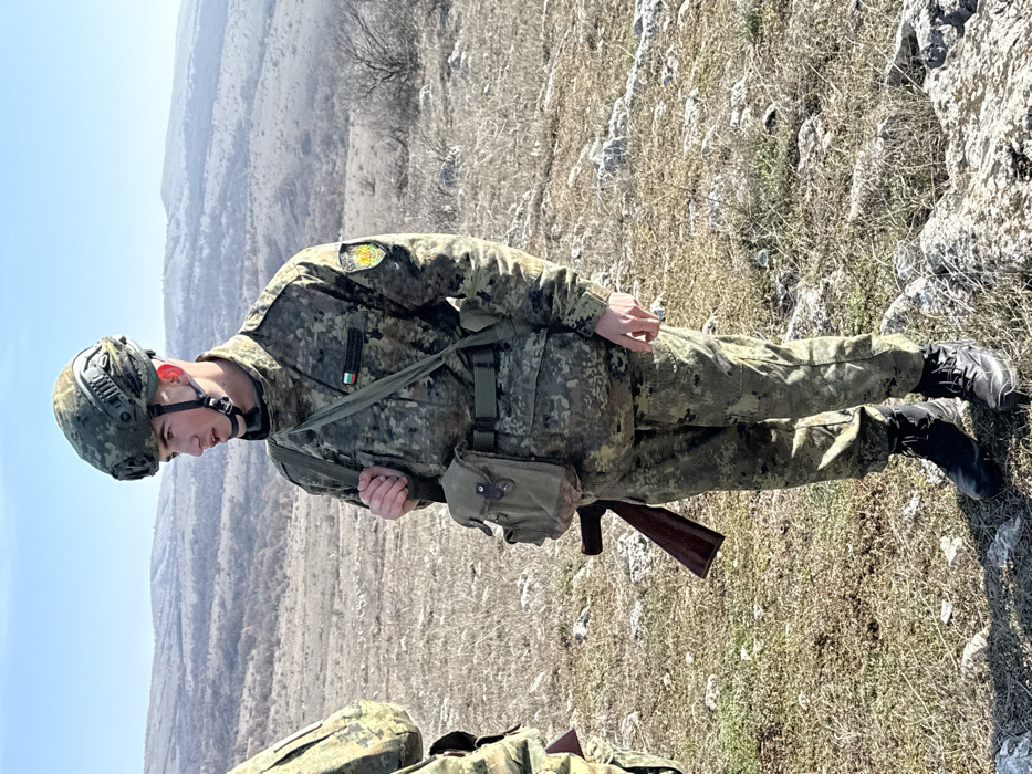 A young male, clad in a digital camouflage uniform and an olive green tactical helmet, stands on a dry, rocky, and sparsely vegetated hill in Opitsvet, Bulgaria