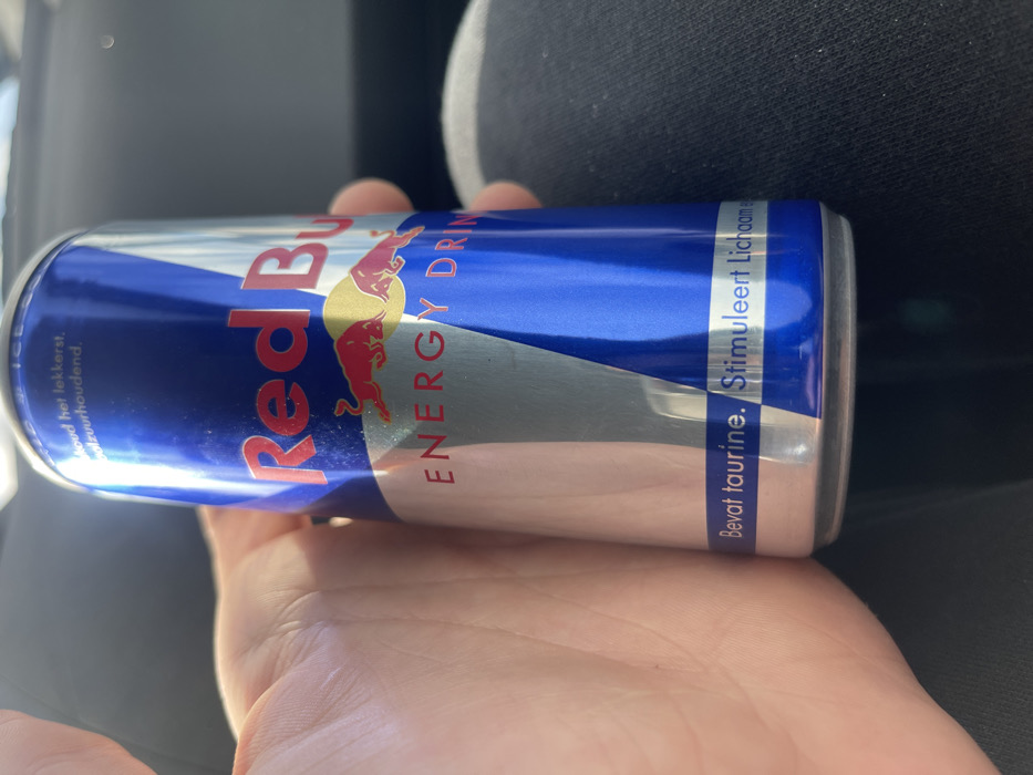 The scene depicts a close-up, angled view inside a vehicle in Maasdijk, Netherlands. A human left hand, showing visible skin texture and creases, is holding a standard blue and silver Red Bull energy drink can vertically. The can features the "Red Bull" logo in red, two red bull figures facing each other under a yellow sun disc, and the text "ENERGY DRINK." Dutch text is visible at the top, stating "Houd het lekkerst koel/koudhoudend," and at the bottom, "Bevat taurine. Stimuleert Lichaam." The background is out of focus, revealing dark, indistinct areas consistent with a car interior. Part of the individual's dark, ribbed clothing (likely trousers) is visible in the lower right quadrant. Natural light illuminates the can and hand from the upper left.