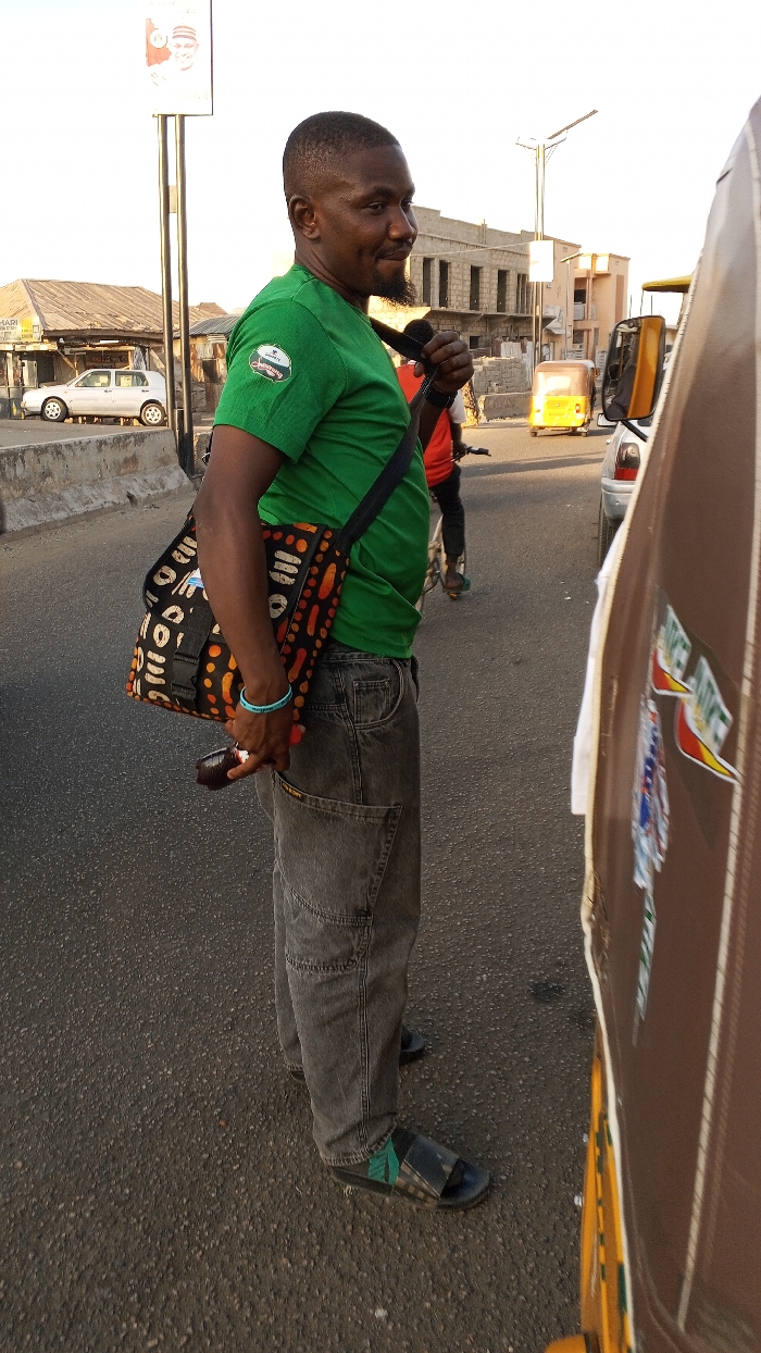 A male subject is depicted in a mid-shot, standing on an asphalt road in Gwagwarwa, Nigeria, facing slightly right and looking towards the camera with a subtle smile. He has dark skin, short dark hair, and a trimmed beard and mustache. He wears a short-sleeved green t-shirt with a circular logo on the left sleeve and dark grey cargo-style jeans. Black open-toed sandals are on his feet, with a visible green striped sock on his right foot. A black messenger bag with an orange, black, and white abstract pattern is slung across his body. A light blue beaded bracelet is present on his left wrist. His left hand holds a dark brown plastic bottle, partially obscured by the bag. In the immediate foreground on the right, a partial, blurred view of a brown and yellow motor tricycle (Keke Napep) body is visible, displaying "WE LIVE" stickers. The background presents an urban street scene under daylight. On the left side of the road, beyond a concrete barrier, a silver sedan is parked in front of a single-story building with a corrugated metal roof, partially marked with a "HAR!" sign. Behind these are multiple concrete buildings, some appearing incomplete or under construction. A metal pole supports a white rectangular sign displaying a portrait on the far left. In the mid-ground, a yellow motor tricycle moves away from the camera, followed by a white car. Further right, completed buildings with light brown facades are visible alongside additional structures under construction. A tall street light pole with solar panels is present in the distant background.
