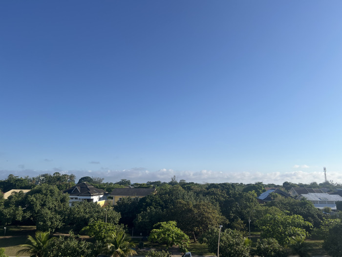 The image showcases a clear, bright blue sky that dominates the frame. Below, a line of lush, green trees obscures most of the view. Buildings are interspersed among the trees, with glimpses of white, yellow, and grey structures. A telecommunications tower is visible at the right edge of the image. A park with streetlights is in the foreground.