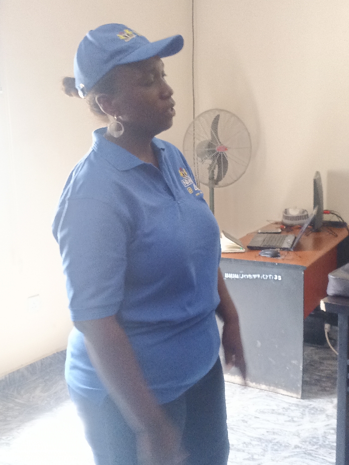 An adult individual with dark skin, appearing female, stands in profile facing right within an indoor environment located in Jos, Nigeria