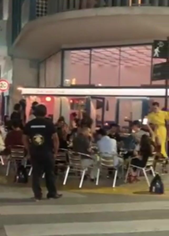 n outdoor area of a restaurant or bar at night. Several people are seated at tables, eating and drinking. A person wearing a bright yellow outfit is standing near a street sign, interacting with people at the tables. Another person, possibly security, stands near the crosswalk, facing the restaurant. The environment includes city buildings and street signs, creating an urban outdoor dining scene.