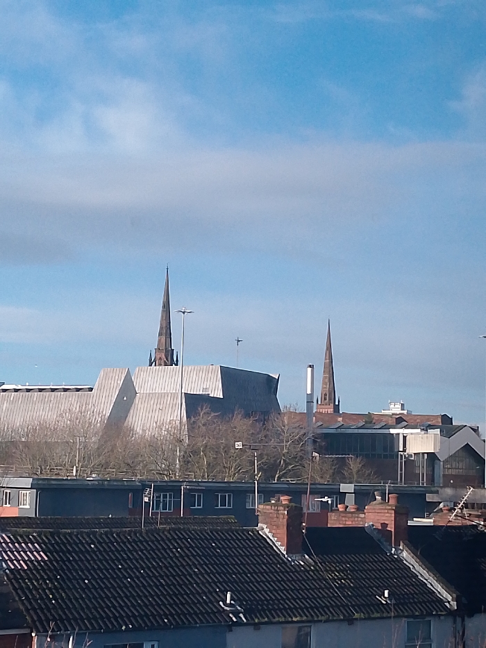 The image displays a panoramic view of Coventry city center, United Kingdom, under a bright blue sky with scattered white clouds. In the foreground, dark grey tiled residential rooftops with red brick chimneys and television aerials are visible. Above these, a row of dark-colored buildings with multiple white-framed windows fronts a line of bare deciduous trees. The midground is dominated by the Herbert Art Gallery & Museum, characterized by its complex, angular light grey metal-paneled roof system. Behind the museum, the tall, slender, dark brick spire of Coventry Cathedral (St Michael's Cathedral) rises on the left, adjacent to a street light pole with multiple lamps. Further to the right, another similar but slightly less prominent dark spire, belonging to Christ Church, is visible among other city buildings and a tall, slender, light-colored industrial vent pipe. A small, dark cross-shaped structure is present on a rooftop between the two main spires. The scene is static, with no visible human subjects or explicit actions.