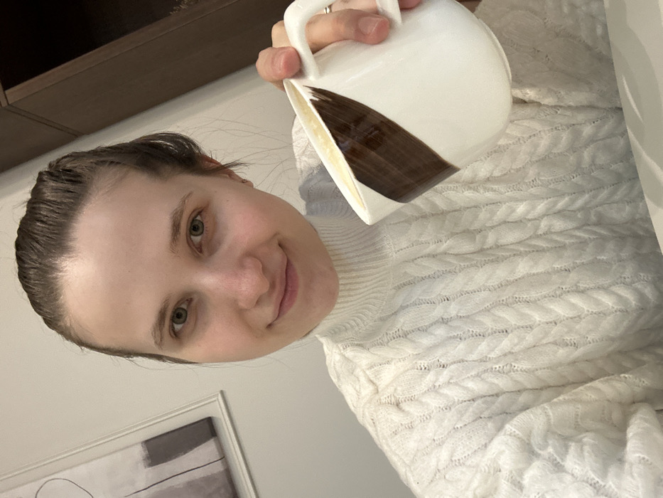 The image displays a single female subject in a close-up, frontal view within an indoor setting in Khimki, Russia. The subject is a young adult with light skin, green eyes, and dark hair pulled back. She wears a white, cable-knit turtleneck sweater and exhibits a slight smile. Her right hand, on which a silver-colored ring is visible on the ring finger, holds a white ceramic mug featuring a diagonal brown design. The mug contains a light-colored beverage. The background to the left shows a portion of a framed abstract artwork with grey and white tones on a light-colored wall. To the right, a dark brown wooden cabinet or shelving unit is partially visible. A light-colored surface is present in the lower foreground.