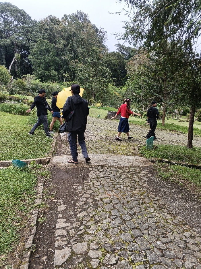 The image portrays an outdoor scene within what appears to be a park or botanical garden. The specific location within Kwekwe, Zimbabwe, cannot be ascertained from the visual evidence. The sky is overcast. **Environment:** A non-uniform stone-paved path, approximately 1.5 to 2 meters wide, originates in the foreground and extends into the midground, subtly ascending. The path is flanked by green grass lawns on both sides. A concrete border runs along the left edge of the paved path, containing a segment of exposed dark soil. On the right, a small green-painted wooden post is visible in the grass. In the background and midground, dense foliage, including numerous mature trees and various shrubs, forms a natural backdrop. A small, light blue-green object rests on the grass near the left path border. **Individuals:** Five adult individuals are present: 1. **Foreground Center:** A person, viewed from behind, walks on the paved path. They wear a dark jacket, dark cargo pants, and dark flip-flops, carrying a dark shoulder bag. 2. **Mid-ground Left:** A person in a black long-sleeved shirt and grey pants is depicted stepping from the grass onto the paved path. A camera is suspended around their neck. 3. **Mid-ground Left-Center:** A person, partially obscured, is positioned on the grass. They hold a bright yellow open umbrella overhead and wear a dark top with light-colored shorts or a skirt. 4. **Mid-ground Right-Center:** A person with long, light brown hair, dressed in a red long-sleeved top and a dark blue skirt, stands or walks on the paved path with arms slightly outstretched. 5. **Mid-ground Far Right:** A person, seen from behind, walks on the paved path. They are dressed in a dark long-sleeved shirt and dark pants. **Actions/Interactions:** The individuals appear to be ambulating through the landscape. The open yellow umbrella suggests protection from precipitation or sun, given the overcast conditions. No explicit interactions among the individuals are discernible.