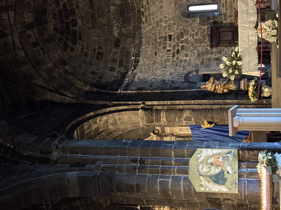 The image displays the interior of the Church of Santa Margherita d'Antiochia in Vernazza, Italy. The environment is characterized by large, dark, rough-hewn stone blocks forming massive structural elements, including square and rectangular pillars, pointed arches, and a vaulted, domed ceiling. The lighting is dim, suggesting a solemn atmosphere, with light sources localized to specific areas and a narrow, arched window visible on the right wall. In the left foreground, a multi-tiered metal stand holds numerous lit votive candles. Adjacent to this display are potted white poinsettia plants. Above, affixed to a stone pillar, is an octagonal painting depicting the Virgin Mary in a dark blue robe holding the infant Jesus. Faint angelic figures are visible in the background of the artwork. Towards the center, a light-colored fluted stone pedestal stands in the mid-ground. Behind this pedestal, a section of dark blue fabric is draped against a stone wall or niche. To the right of the fabric, a small golden figure, appearing to be a cherub or angel, is mounted on the wall. Further to the right, a golden statue of a robed female figure, positioned on an ornate red and gold pedestal, stands prominent. In front of this statue, an altar table is covered with a white tablecloth featuring lace trim, embroidered patterns, and a red braided cord along its edge. On the altar, floral arrangements of white peace lilies or similar flowers are present, alongside another potted white poinsettia. To the right of the altar, a dark wooden cabinet or piece of liturgical furniture is situated against the stone wall beneath the arched window.