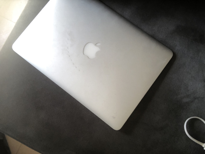 - "The scene depicts a silver-colored Apple MacBook laptop resting on a dark, textured fabric surface, likely a rug or upholstered furniture, within an indoor environment in Ogbomosho, Nigeria" by FM-UQe3P2, licensed under CC BY 4.0