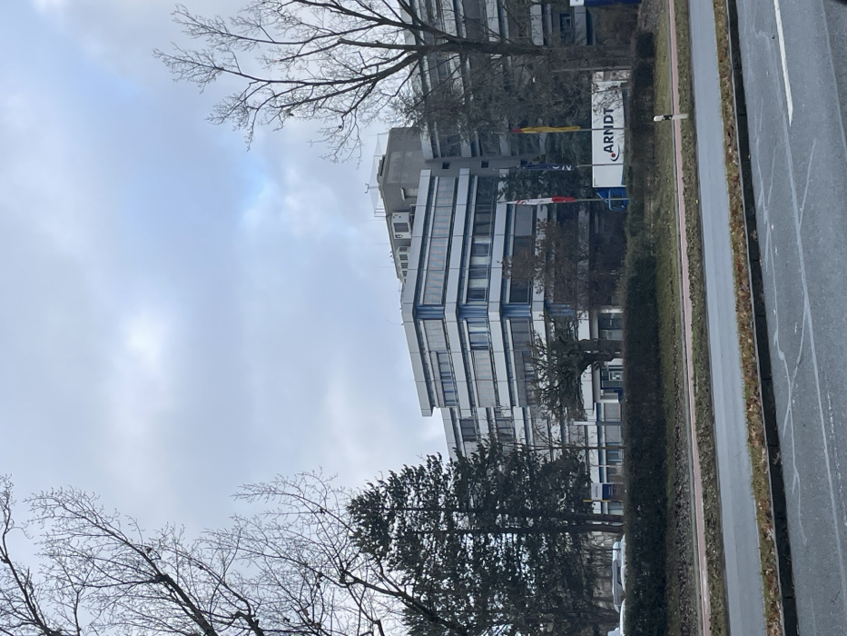 The image displays the exterior of a multi-story building located at Witschelstraße 100, 90459 Nuremberg, Germany. The scene is captured under an overcast sky, indicative of a dull, possibly winter or late autumn, day given the bare deciduous trees. In the immediate foreground, a dark grey road, possibly wet, stretches horizontally with faint white markings. Parallel to the road and closer to the building is a distinct red-surfaced path, likely a bicycle lane, separated by a narrow verge. Across the road, a neatly trimmed dark green hedge delineates the building's property line. Behind the hedge, on the right side, a prominent white rectangular sign with the word "ARNDT" in dark lettering and a red circular logo is clearly visible. Adjacent to the sign, three flags fly on flagpoles: a vertically striped red and white flag, a dark blue flag with a white emblem, and a yellow flag. A blue and white truck, branded with "ARNDT," is partially visible behind the hedge near the flags. The main subject is a modern, multi-story (approximately five to six visible floors) office building. Its facade features horizontal bands of light grey paneling alternating with darker tinted windows, some framed or accented with blue. The building has a staggered or stepped architectural design. The rooftop exhibits various mechanical units and vents. Several evergreen conifer trees are present on the left side of the property, alongside numerous bare deciduous trees scattered across the grounds. On the far left, behind the conifers, several parked vehicles are partially visible. No individuals are present in the scene, and no actions or interactions are depicted.