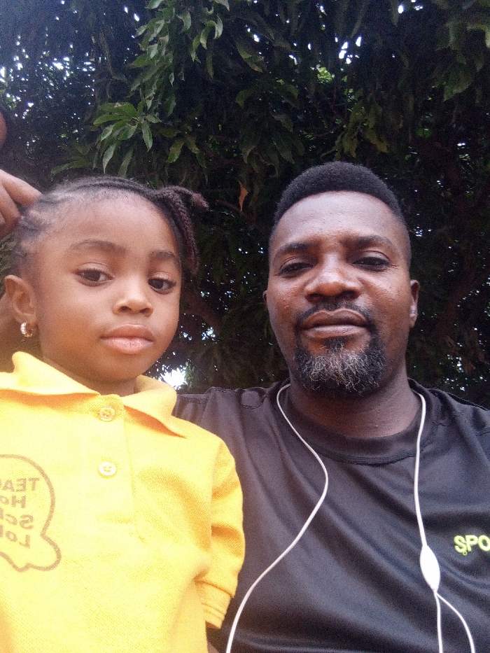 A man and a young girl are posing for a selfie. The man has a beard and mustache, and is wearing a black t-shirt and earphones. The young girl is wearing a yellow polo shirt with the logo of "Teddy Hope School." She has braided hair with small pigtails. The background features a leafy tree. Part of another person's hand appears at the top left of the frame.