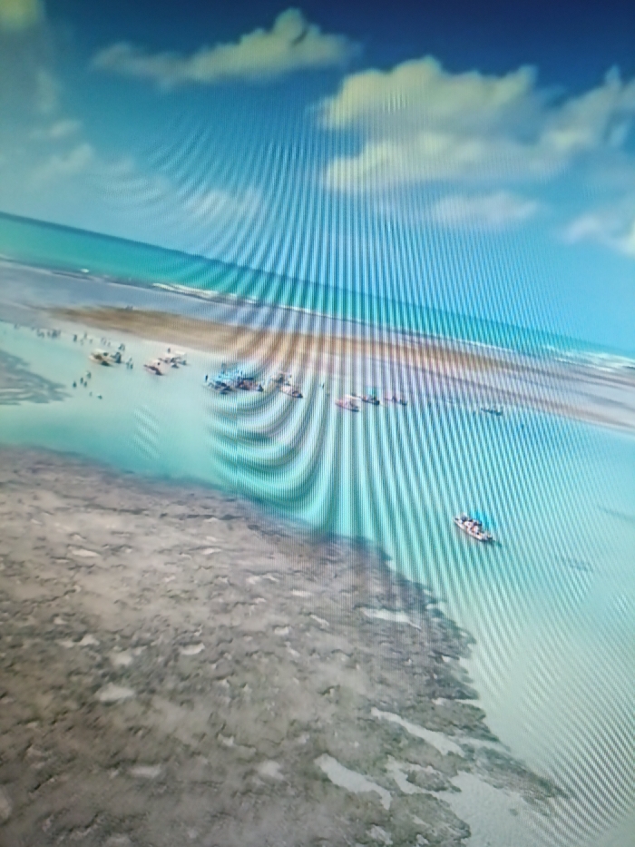 n aerial view of a shallow body of water. The water is light blue and the bottom is visible, revealing a sandy bottom with patches of seagrass. There are several small boats in the water, some with people on board, and there are several people in the water. The water is calm and there are no waves. The sky is blue and there are some white clouds. The location is the beach in Netanya, Israel, at coordinates 32.32 latitude and 34.85 longitude. The image is slightly distorted with visible lines across the water.