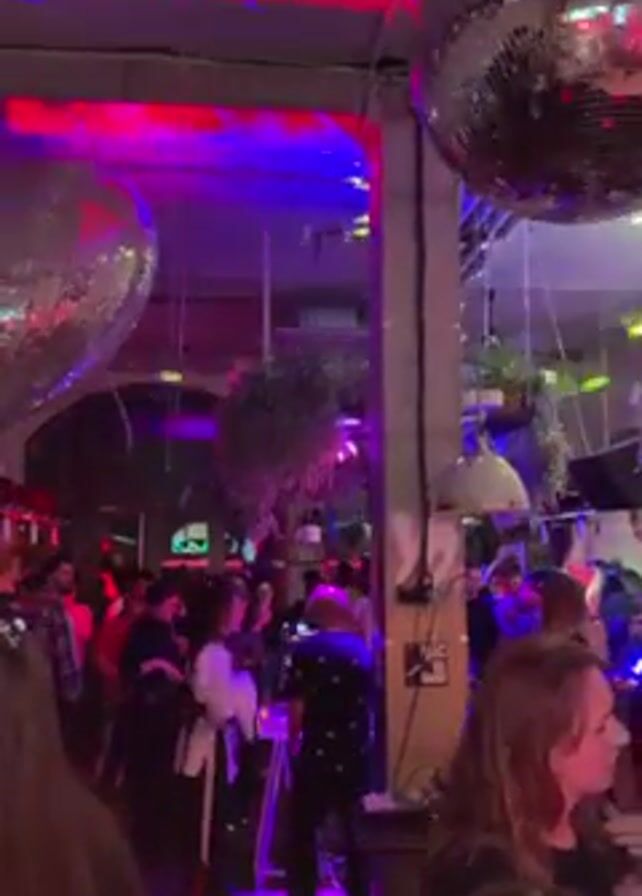 crowded bar or club with people socializing and enjoying themselves. There are two large disco balls hanging from the ceiling, which reflect colorful lights onto the crowd. The lighting is primarily purple and red. People are dressed in various outfits and are standing, talking, and some appear to be dancing. There are some plants hanging from the ceiling as well, adding a touch of greenery to the interior. A person is operating some sound equipment, presumably a DJ. The atmosphere appears lively and festive.