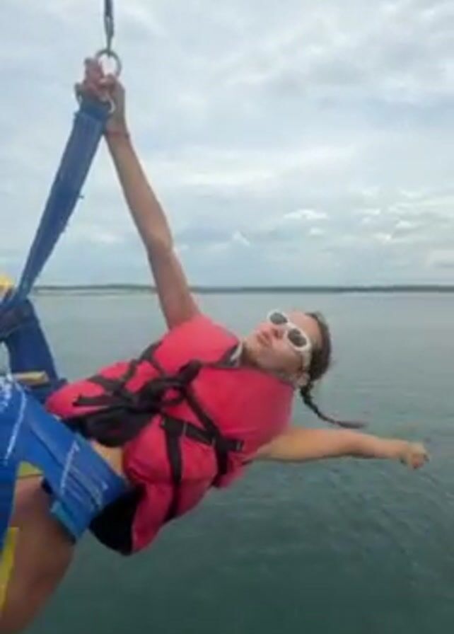 woman parasailing over the ocean. She is wearing a red life jacket and sunglasses, and her hair is in a braid. She is hanging from the parasailing rig, holding onto the straps. The ocean is dark blue, and there is land visible in the distance. The sky is cloudy.