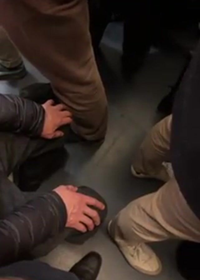 Several people are crowded together in what appears to be a public space, perhaps on a train or bus. The focus is on their legs and feet. The flooring is a dark grey with visible marks or patterns. The people are wearing various types of pants and shoes, including dress shoes, sneakers, and what appears to be khaki pants and brown trousers. One person has their hands clasped over their knee. The lighting is somewhat dim, giving the scene a slightly drab and enclosed atmosphere.