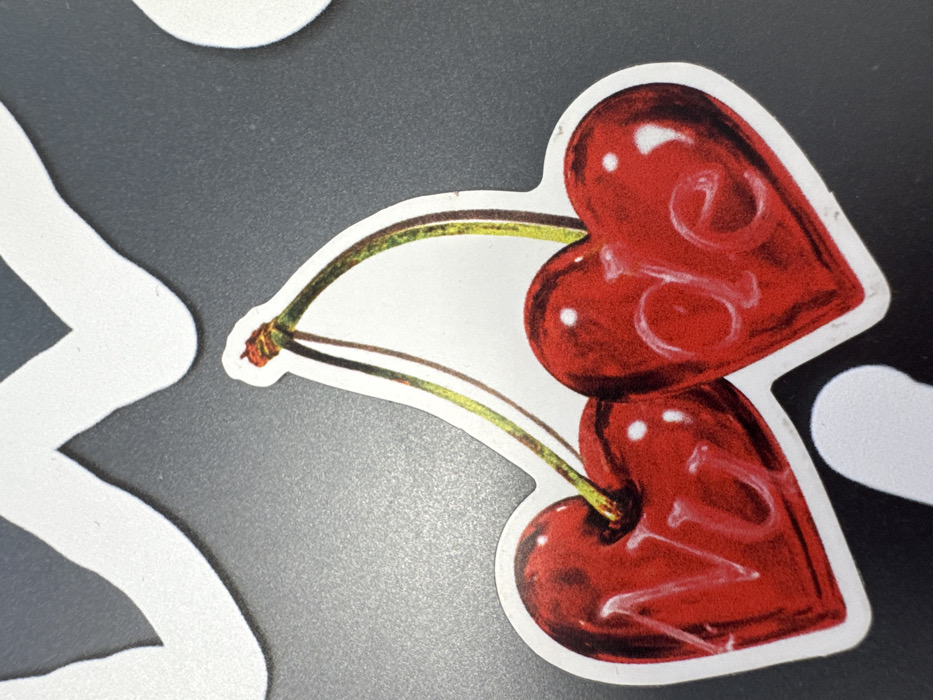 A single, die-cut sticker is centrally positioned on a dark gray, flat surface