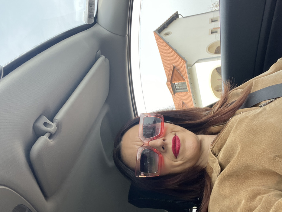 n adult female positioned in the driver's seat of a vehicle, looking towards the viewer. She has dark brown hair and is wearing oversized, square-framed sunglasses with a clear pinkish-red gradient frame and dark lenses. Her lips are coated with bright red lipstick, and she displays a neutral to slightly contemplative expression with a furrowed brow. She wears a tan or light brown textured jacket with a visible zipper closure down the front, and a dark seatbelt is diagonally across her chest. The vehicle's interior includes a light gray headliner, with a sun visor in the raised position on the passenger side. Through the passenger window, a distinctive building is visible under an overcast sky. This building is the former railway station (Gare de Roodt-sur-Syre) in Roodt-sur-Syre, Luxembourg. It features a light cream-colored facade, a prominent steeply pitched gable roof covered with orange terra cotta tiles, and a dormer window with dark framing on the visible gable end. The ground level of the building presents a series of three distinct arched openings, and a circular decorative element is visible on the upper facade near the roofline on the right side.
