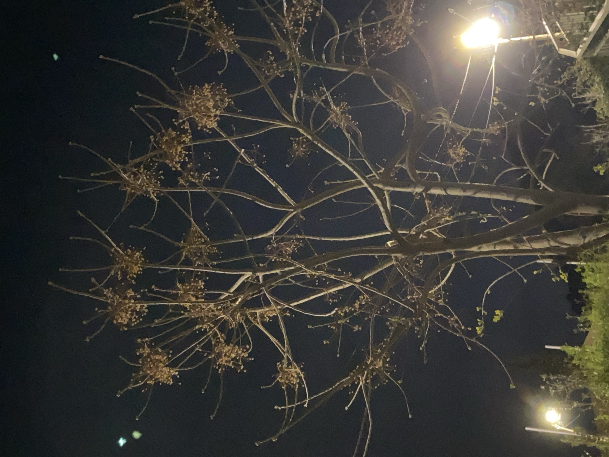 - "A ground-level, nighttime shot shows the branches and seed heads of a bare tree reaching upward towards a bright street light in what appears to be a city environment" by FM-WMNqg1, licensed under CC BY 4.0